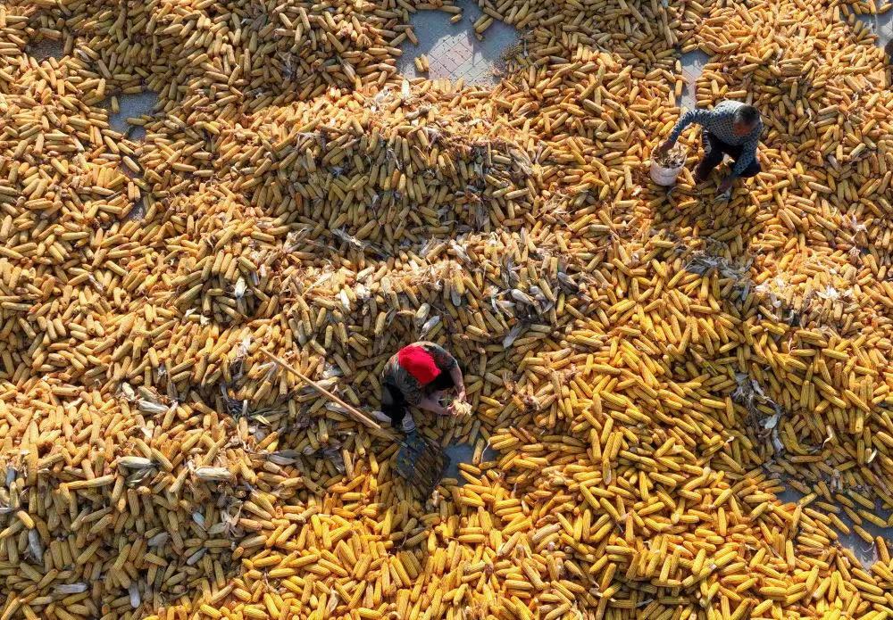 ↑10月4日,河北唐山丰南区唐坊镇孔家庄村的农民在剥玉米皮(无人机照片)。新华社记者 杨世尧 摄