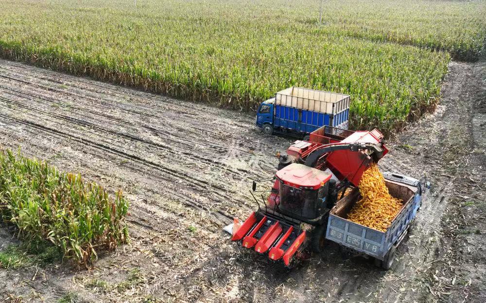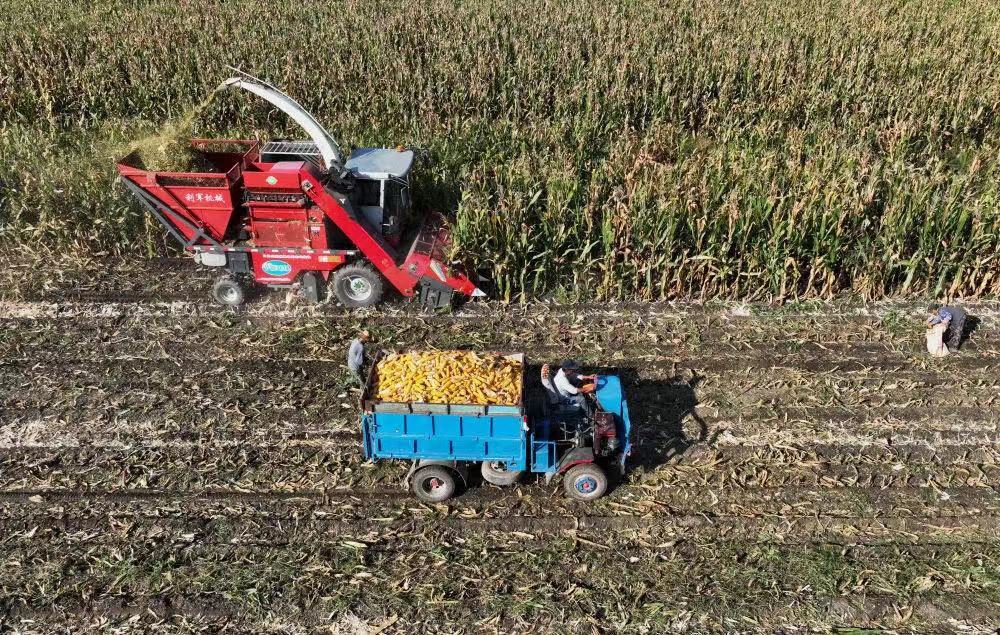 ↑10月4日,河北唐山丰南区岔河镇的农民在使用机械设备收获玉米(无人机照片)。新华社记者 杨世尧 摄