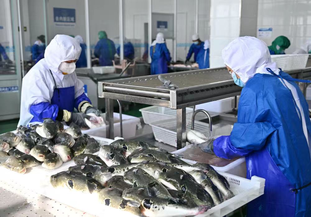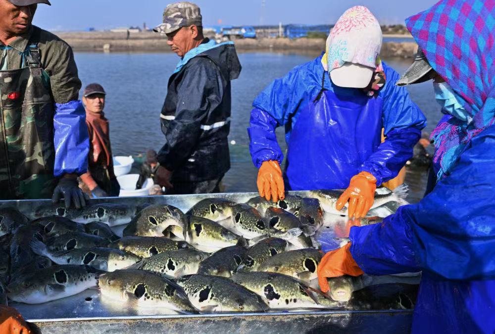近日,河北省唐山市曹妃甸区进入河豚鱼捕捞、加工高峰季节。近年来,唐山市曹妃甸区依托当地临海优势,大力发展河豚鱼、东方对虾等特色水产养殖业,促进渔业增效、农民增收。据介绍,目前该区水产养殖面积达22.6万亩,年渔业总产值达69亿元。