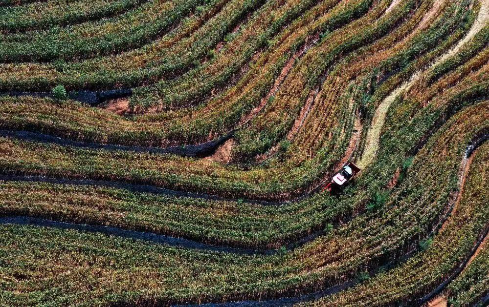 金秋时节,在河北省遵化市刘备寨乡由丘陵坡地改造成的梯田中,农民抢抓农时收获玉米等秋粮。近年来,遵化市大力实施土地整治工程,将浅山丘陵坡地和荒草地改造成保水保肥的水平梯田,促进农业增效、农民增收。新华社记者杨世尧