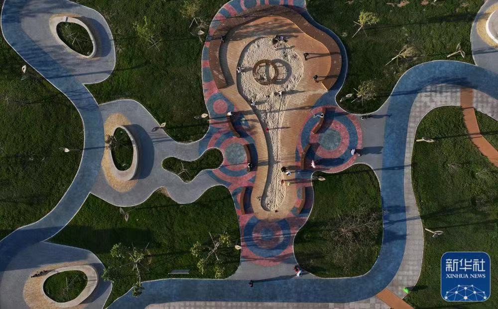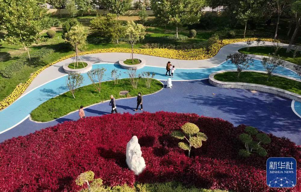 10月15日,市民在唐山市海港经济开发区一处街角公园休闲锻炼(无人机照片)。