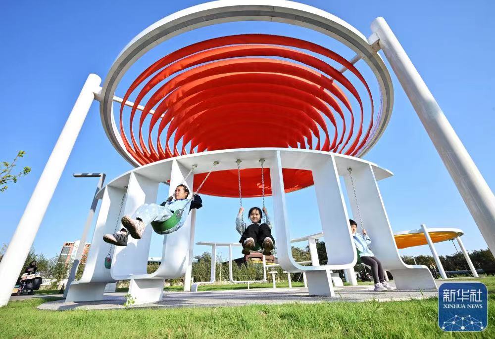 10月15日,小朋友在唐山市海港经济开发区涟漪广场荡秋千。