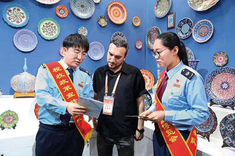 唐山市税务系统组织税收政策宣传服务队走进第二十四届唐山中国陶瓷博览会,向参会展商介绍最新税费优惠政策和办税缴费新举措(2023年9月16日摄) 刘洋摄