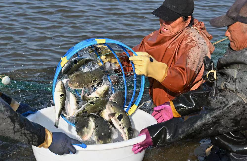 曹妃甸区一家河豚养殖合作社的社员在捕捞河豚。新华社记者 杨世尧 摄