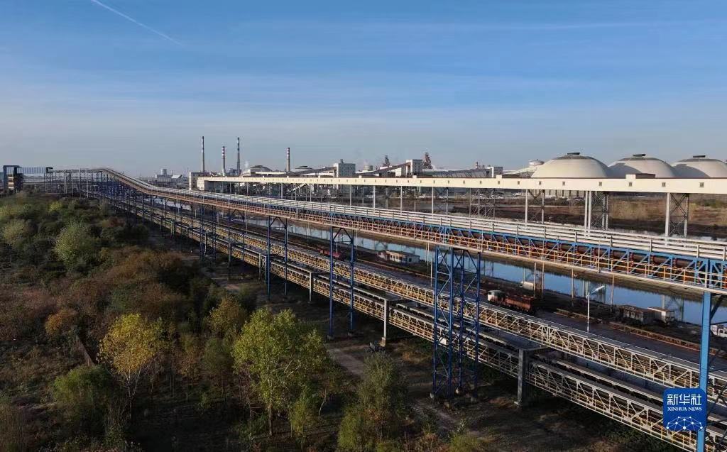 11月12日,车辆从唐山海港经济开发区管带机廊道旁边的公路上通过(无人机照片)。