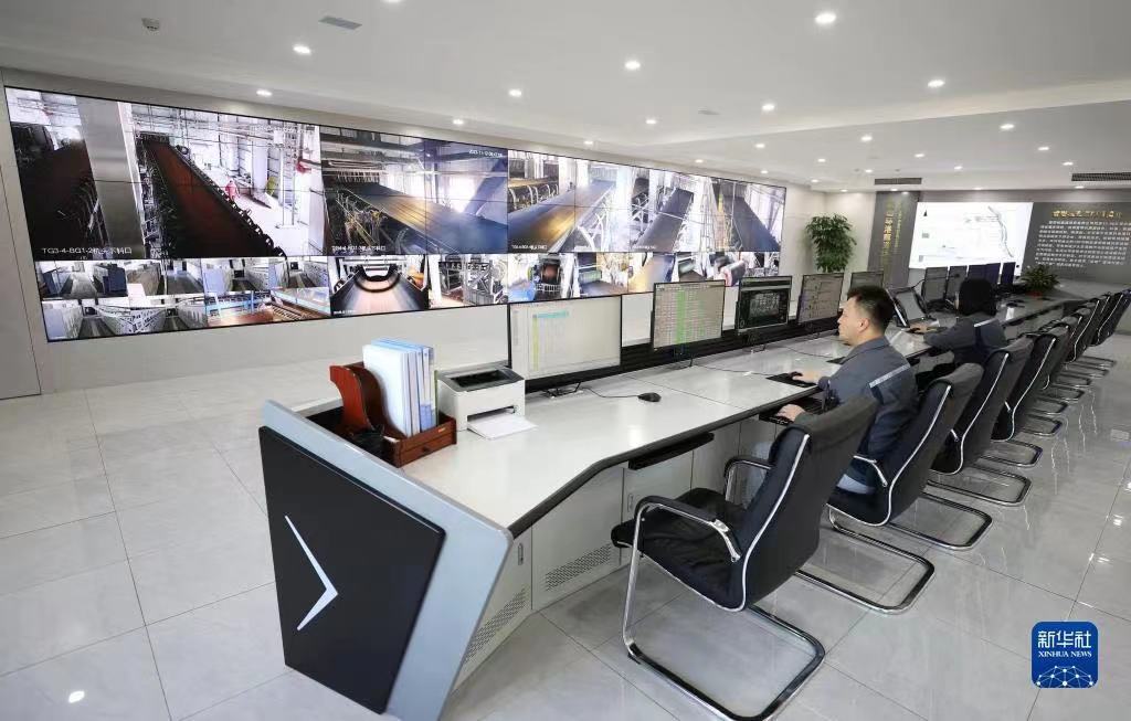 11月12日,工人在唐山海港经济开发区管带机廊道转接机房查看矿石输送情况。