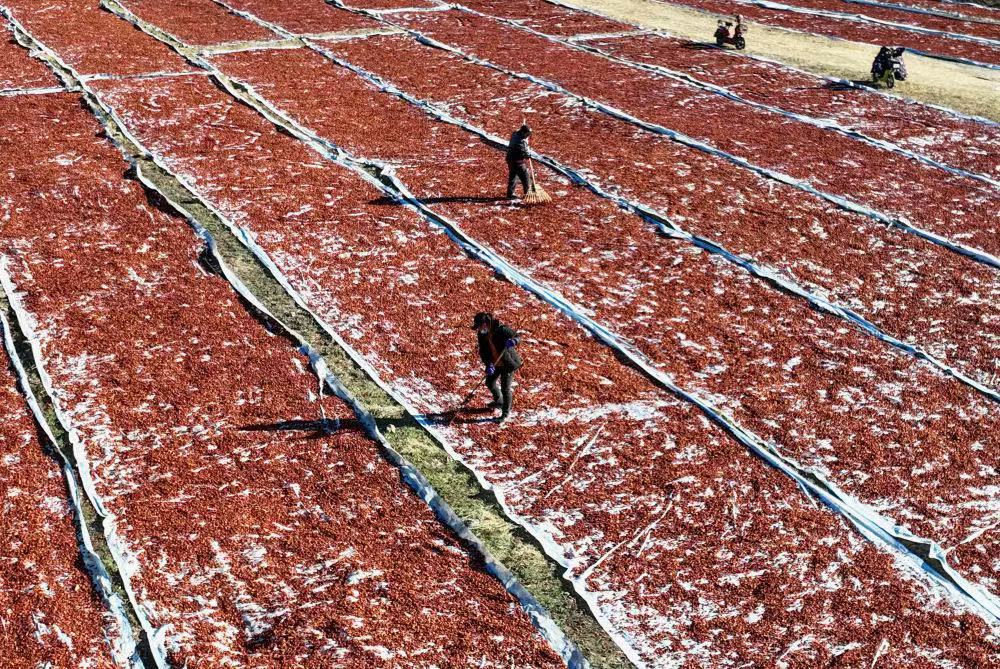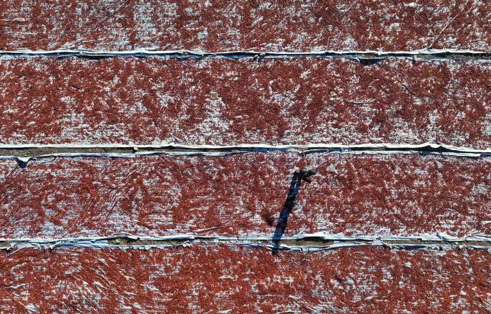 11月14日,河北省遵化市侯家寨镇的农民在晾晒用于中药材的山楂片(无人机照片)。新华社记者杨世尧摄