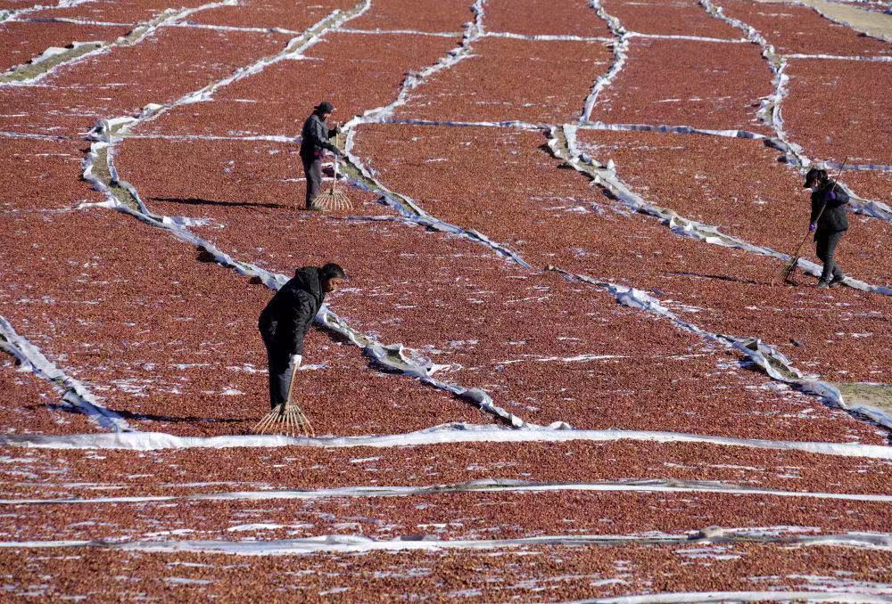 11月14日,河北省遵化市侯家寨镇的农民在晾晒用于中药材的山楂片。新华社记者杨世尧摄
