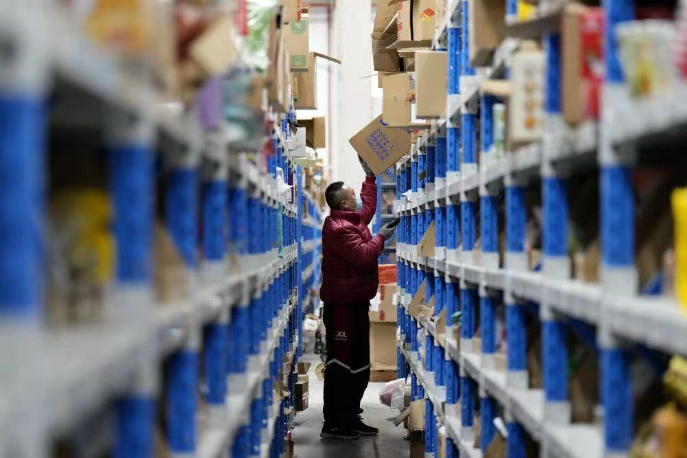 11月16日,在普洛斯唐山丰润物流园,京东物流的工作人员在货柜上查验商品。新华社记者 牟宇 摄