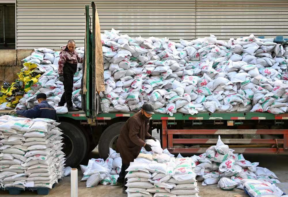 11月16日,在位于唐山市丰润区的唐山公路港物流有限公司,工人在整理农资产品。新华社记者 牟宇 摄