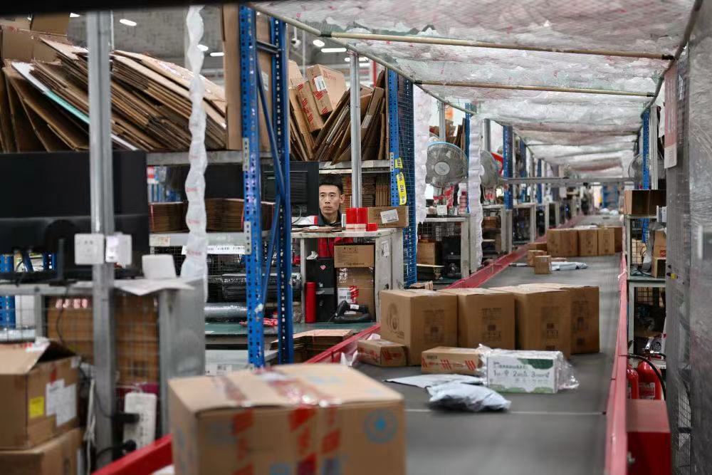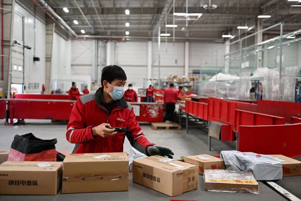 11月16日,在普洛斯唐山丰润物流园,京东物流的工作人员在发送商品。新华社记者 牟宇 摄