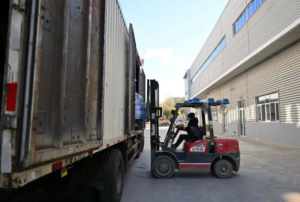 11月16日,在位于唐山市丰润区的唐山公路港物流有限公司,工人驾驶叉车运输货物。新华社记者 牟宇 摄
