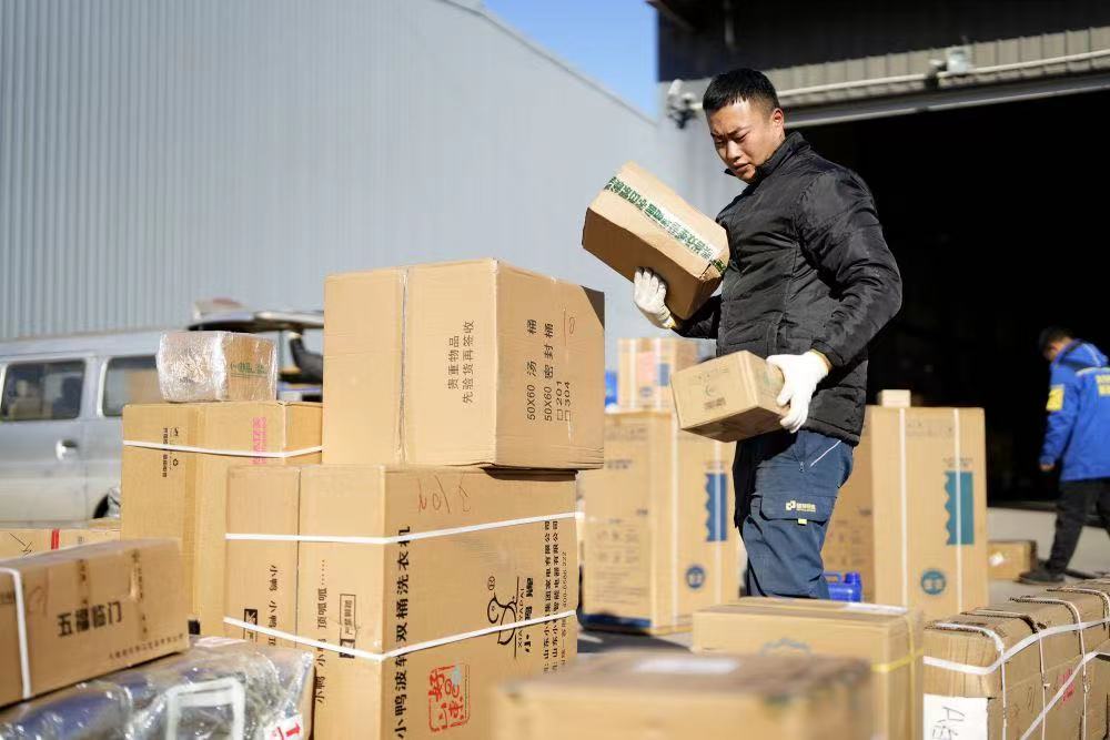 11月16日,在位于唐山市丰润区的唐山公路港物流有限公司,工人在搬运快递商品。新华社记者 牟宇 摄