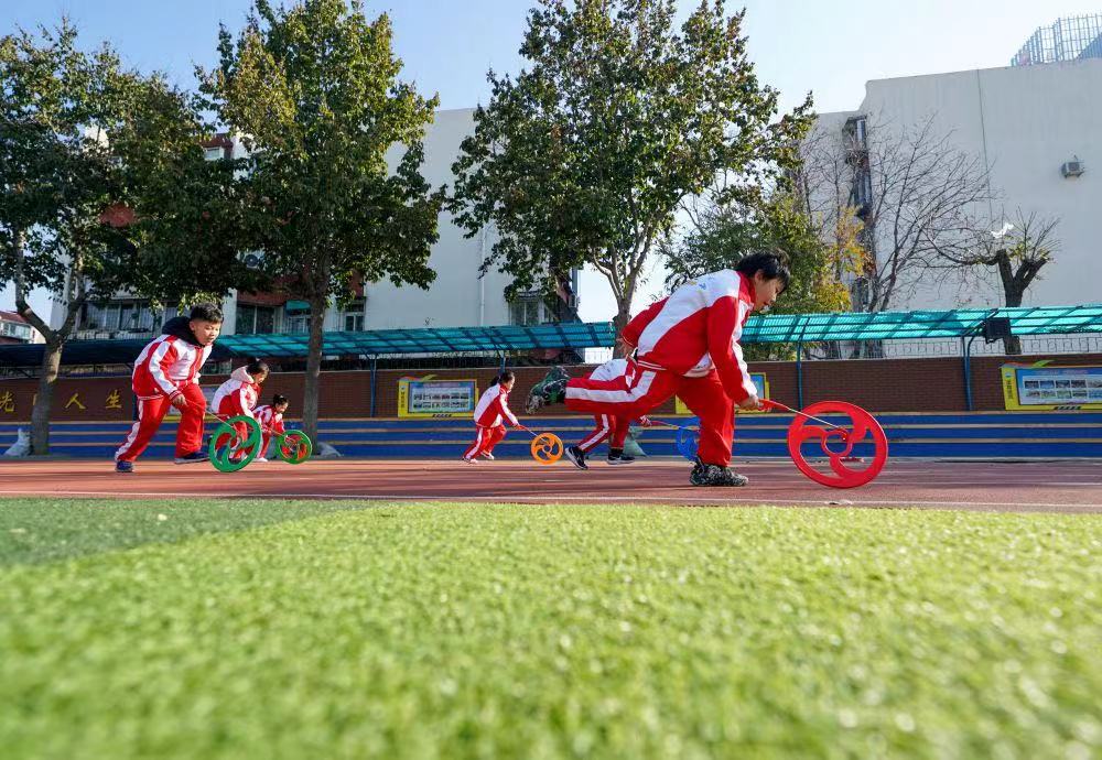 11月17日,河北省唐山市路北区光明实验小学的学生利用课间时间玩滚铁环。新华社记者 牟宇 摄