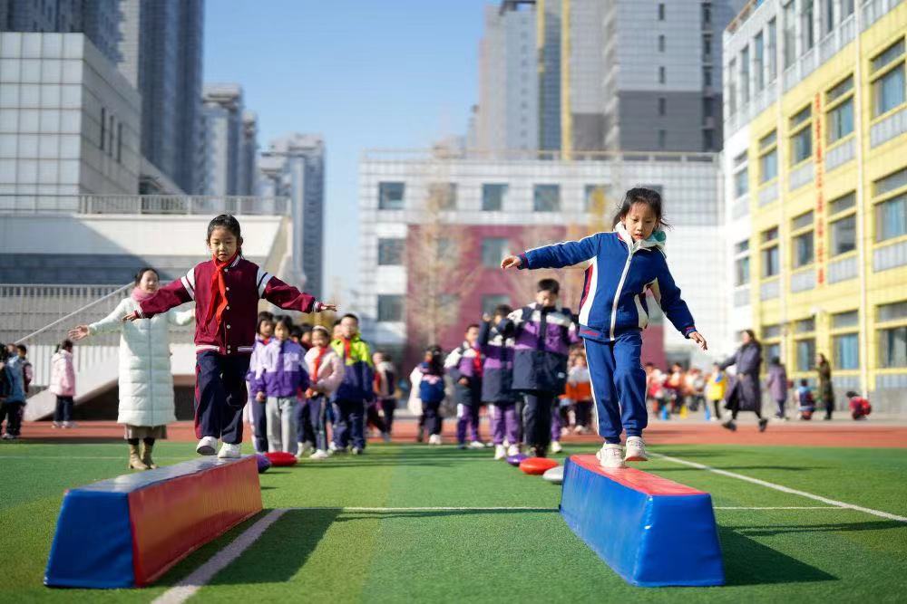 11月17日,河北省唐山市路北区橡树湾小学学生利用课间时间玩平衡木。 新华社记者 牟宇 摄
