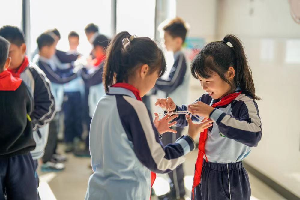 11月17日,河北省唐山市路北区橡树湾小学学生利用课间时间玩翻花绳。新华社记者 牟宇 摄