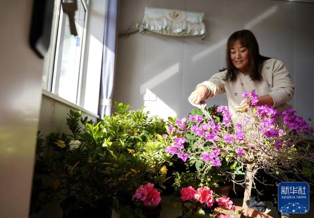 11月17日,河北省滦州市葛庄村一处“美丽庭院”示范户的居民在打理种植的花卉。