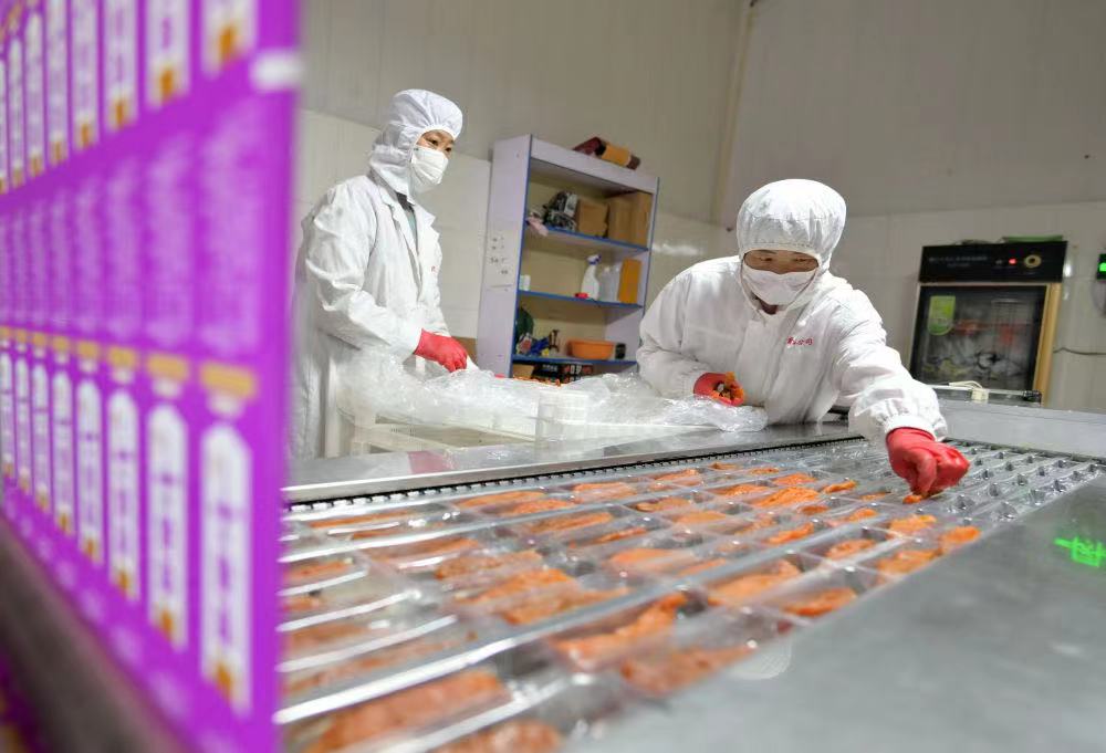 ↑11月17日,河北省滦南县安各庄镇一家食品公司的工人在红薯条包装车间工作。新华社记者杨世尧摄