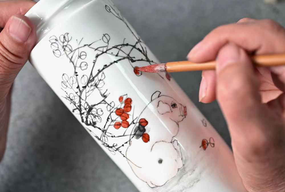 ↑11月21日,一位工艺美术师在唐山市开平区陶瓷文创产业园创作陶瓷绘画作品。