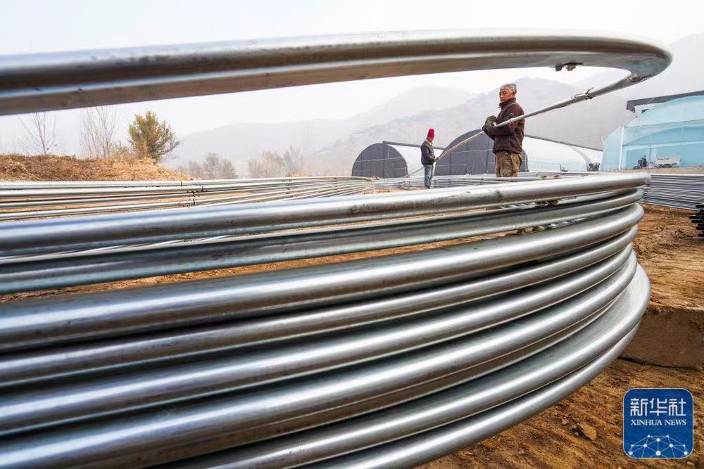 11月22日,河北省遵化市石门镇农民在搬运拱架,搭建设施大棚为蔬菜大棚防寒。