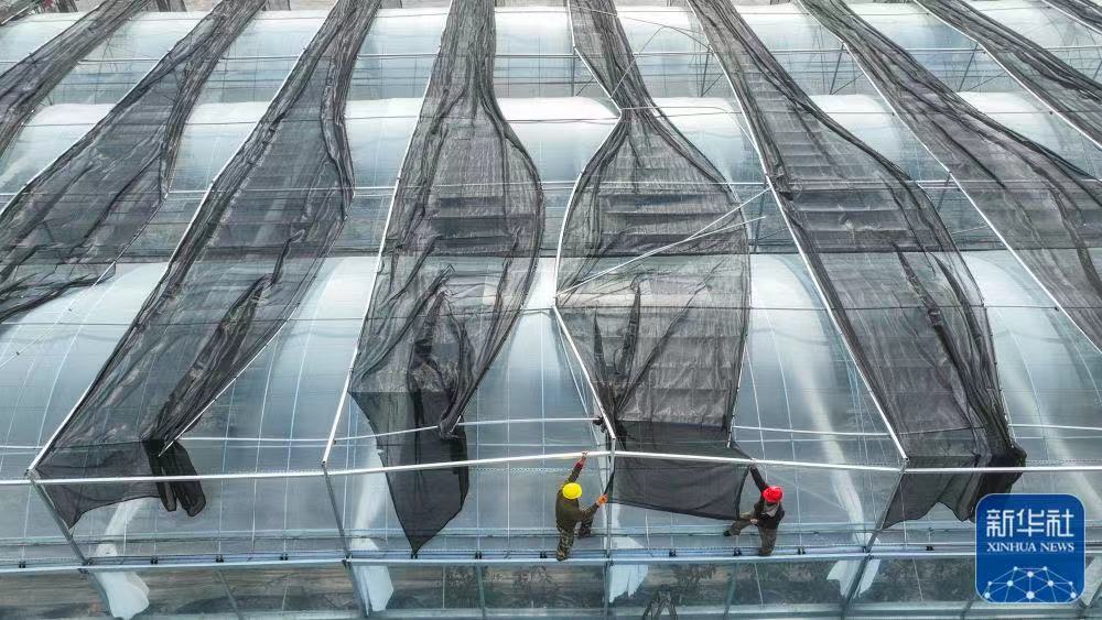 11月22日,河北省遵化市石门镇农民在苫盖设施大棚(无人机照片)。