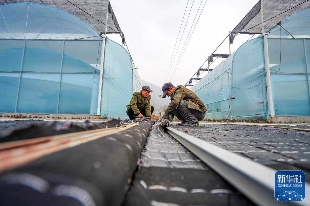 11月22日,河北省遵化市石门镇农民在设施大棚检查增温设备。