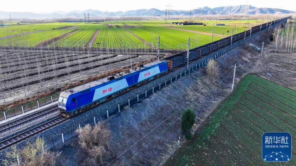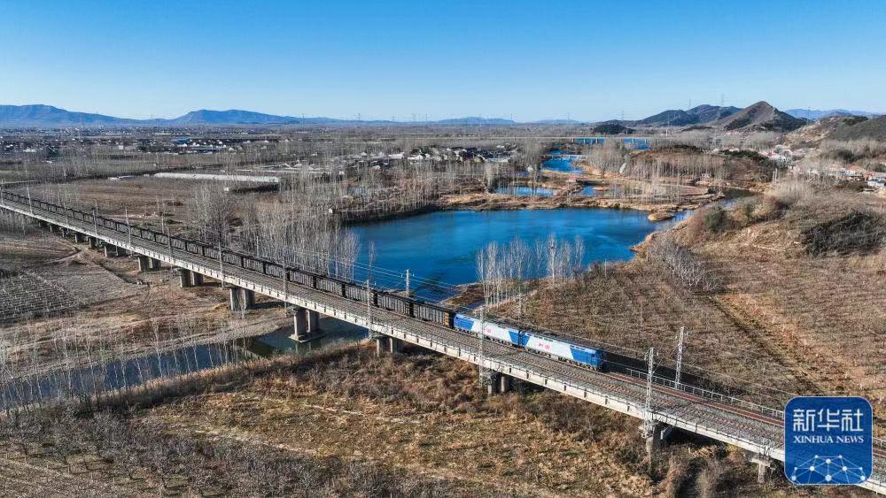 11月23日,在河北省遵化市,一列运煤重载列车驶向秦皇岛方向(无人机照片)。新华社发(刘满仓摄)