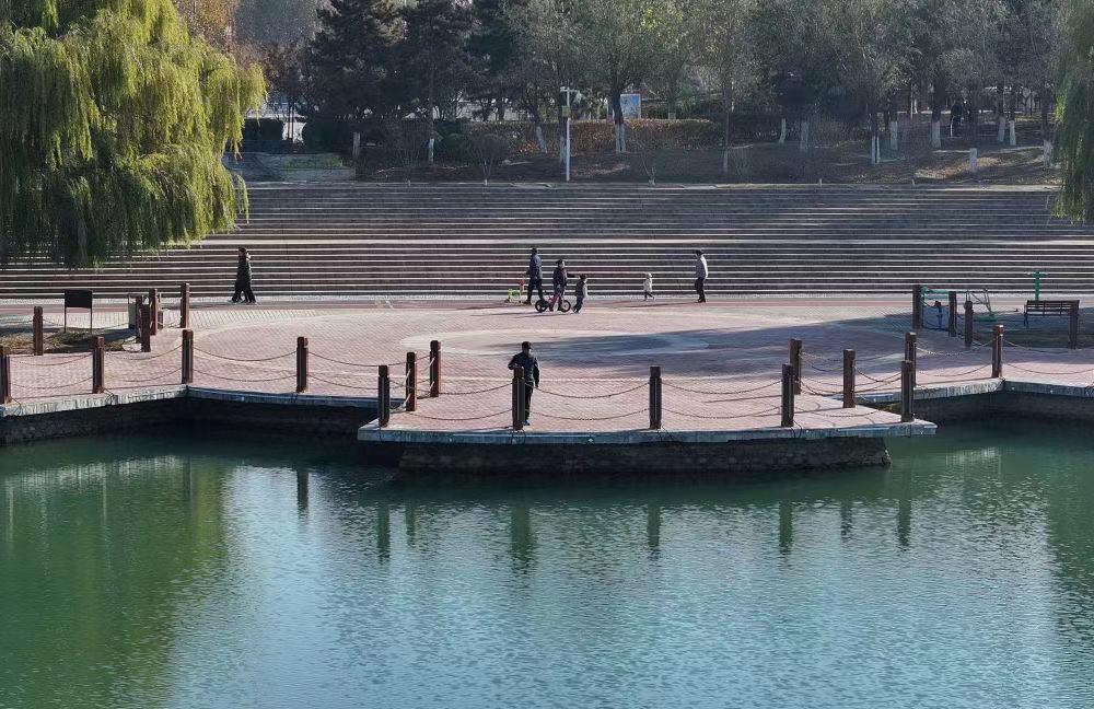 11月26日,市民在唐山市古冶区银湖公园游玩(无人机照片)。