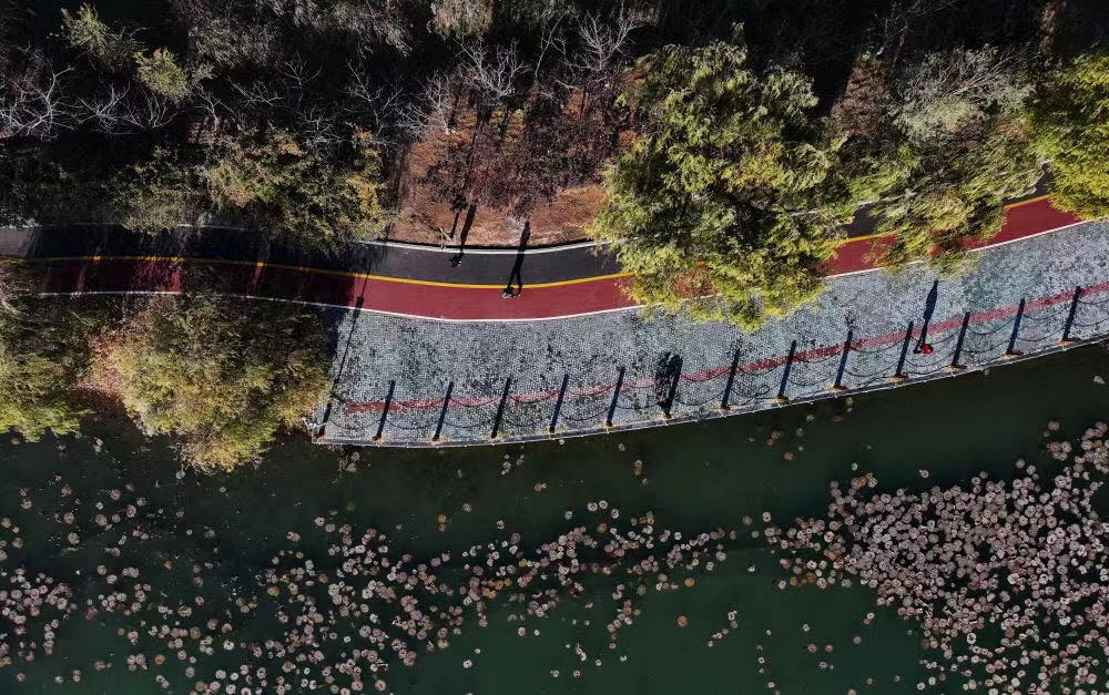 11月26日,市民在唐山市古冶区银湖公园休闲锻炼(无人机照片)。