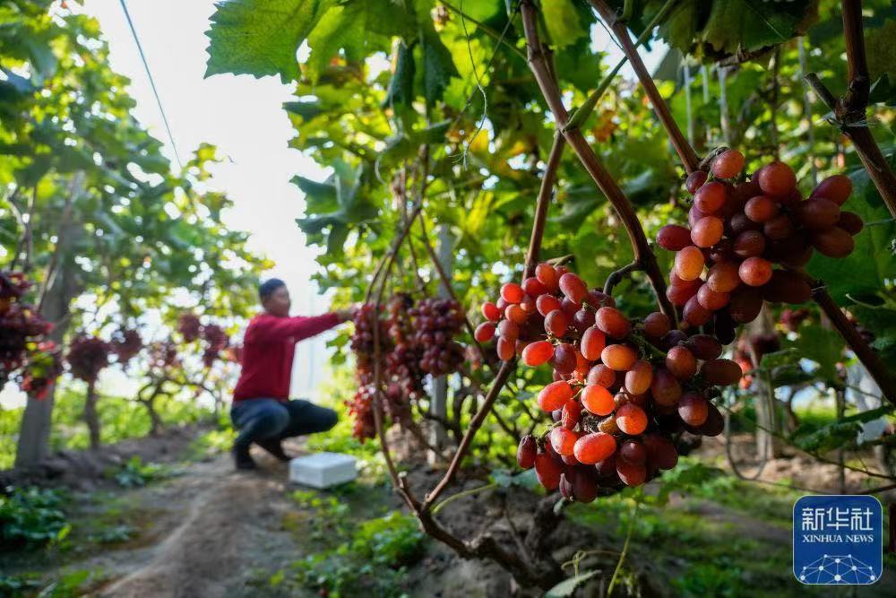 ↑11月26日,游客在河北省滦州市茨榆坨镇芦苇庄村一处大棚内采摘葡萄。