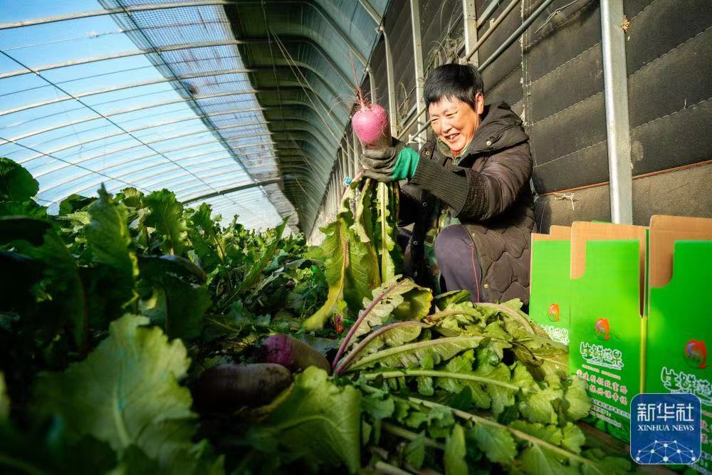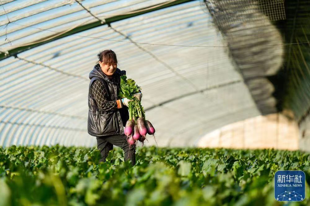 ↑11月26日,河北省滦州市茨榆坨镇芦苇庄村农民在大棚内采收萝卜。