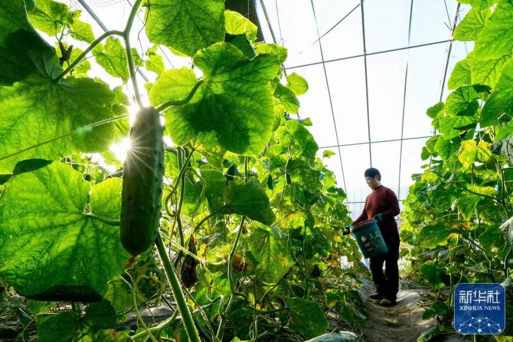 ↑11月26日,河北省滦州市茨榆坨镇芦苇庄村农民在大棚内采摘黄瓜。