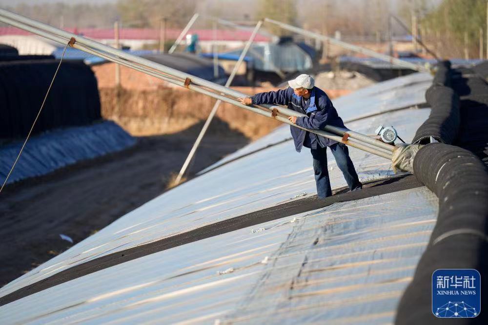 ↑11月26日,河北省滦州市雷庄镇后店子村农民在调整大棚保温被。