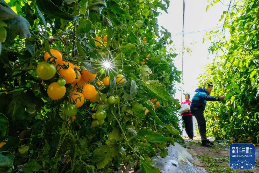 ↑11月26日,河北省滦州市雷庄镇后店子村农民在大棚内采摘水果西红柿。