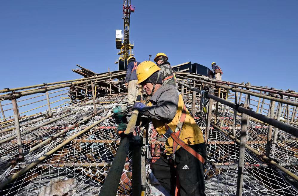 ↑11月26日,工人在河北省唐山市丰润区粮食安全应急储备及食品深加工全链化综合生产基地项目建设工地施工。