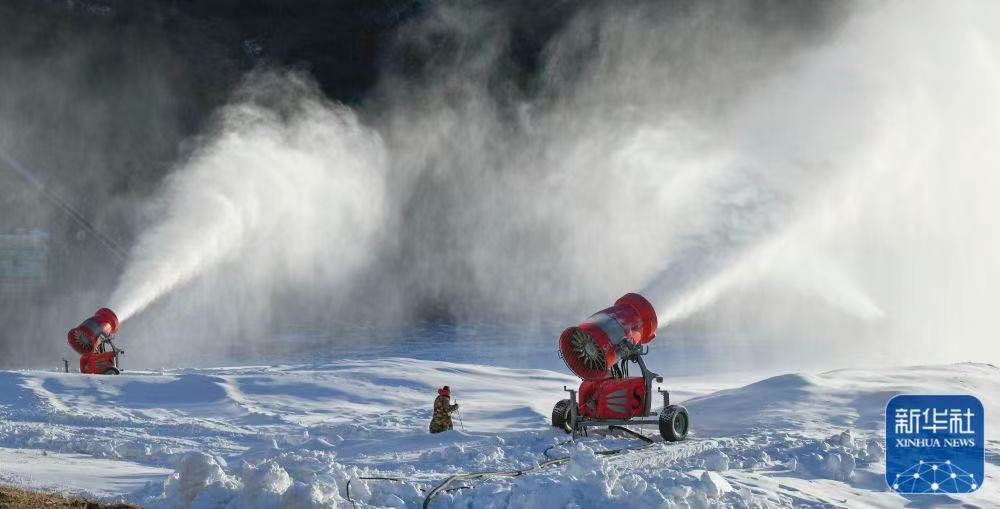 11月29日,工人在玉田县一家滑雪场使用设备造雪。