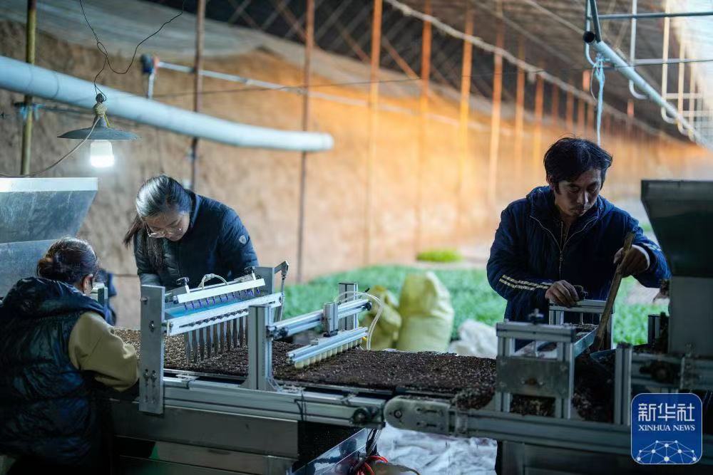 12月5日,河北省乐亭县一家育苗基地的工人在育苗棚内进行播种作业。