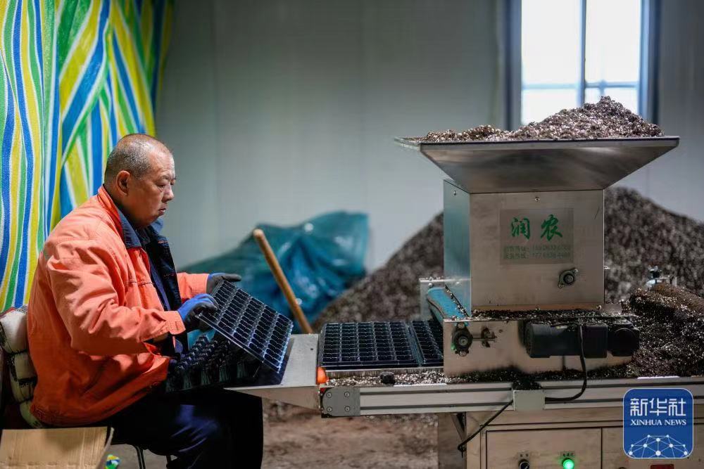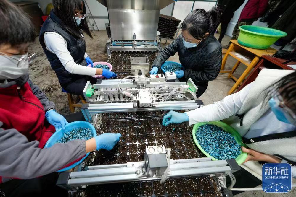 12月5日,河北省乐亭县一家育苗基地的工人在给育苗盘填装培养土。
