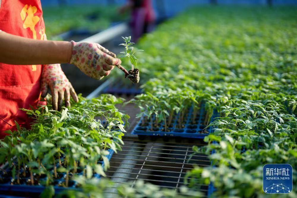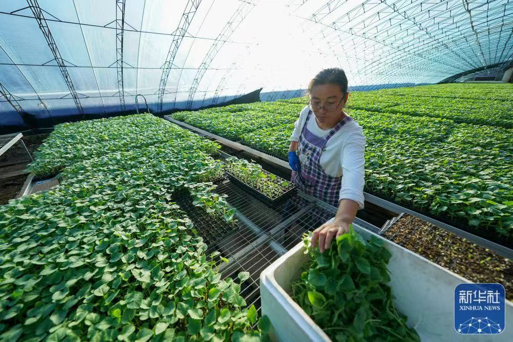12月5日,河北省乐亭县一家育苗基地的工人在育苗棚内打理秧苗。