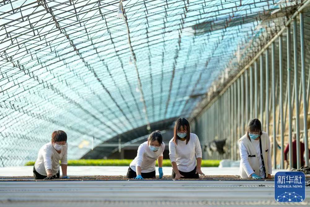 12月5日,河北省乐亭县一家育苗基地的工人在育苗棚内摆放育苗盘。