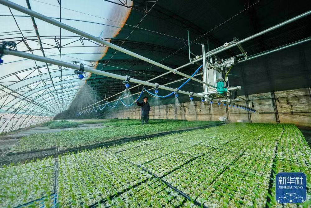 12月5日,河北省乐亭县一家育苗基地的工人在使用自动化设备给秧苗浇水。