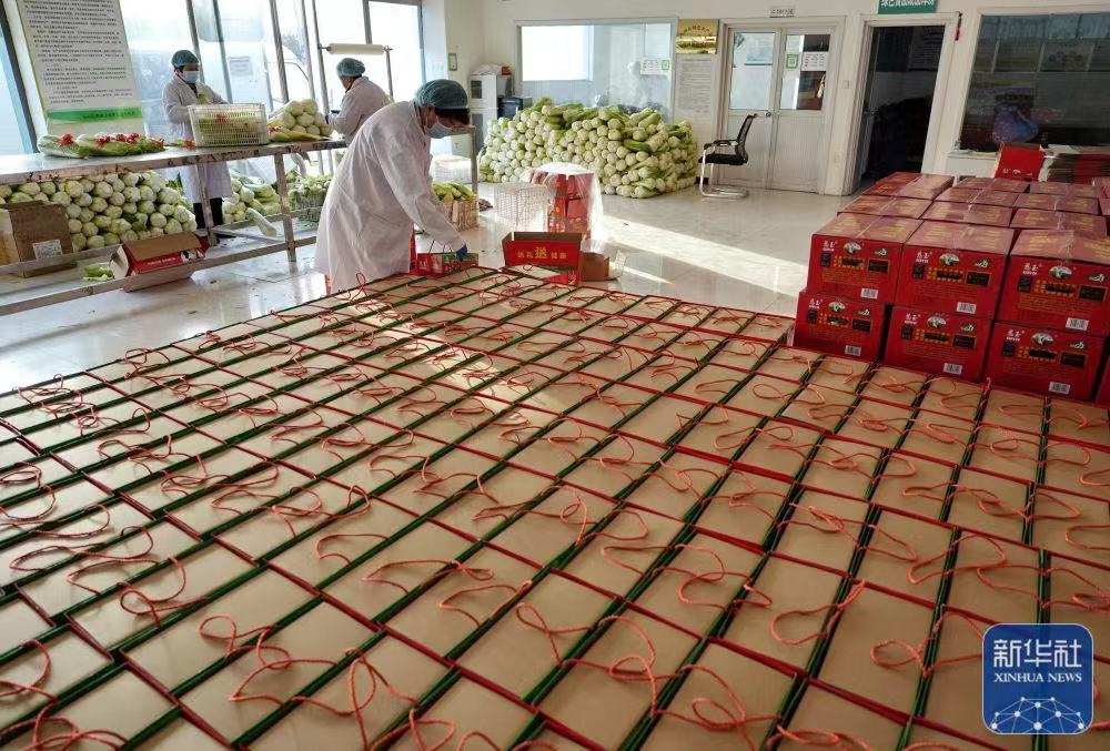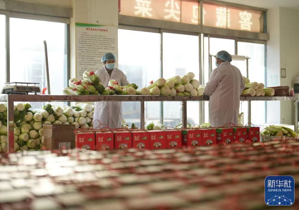 ↑12月8日,河北省玉田县黑猫王农民专业合作社的员工在整理包尖白菜礼盒。