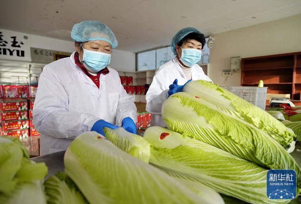 ↑12月8日,河北省玉田县黑猫王农民专业合作社的员工在整理包尖白菜,准备包装。