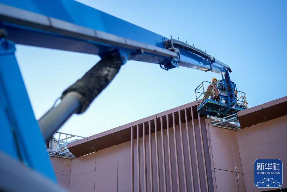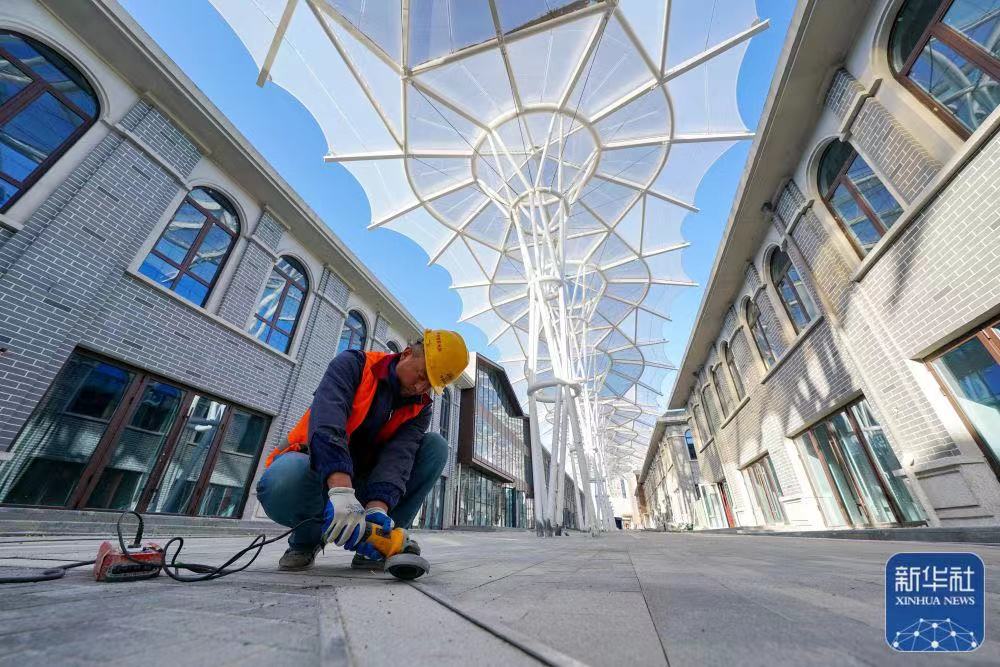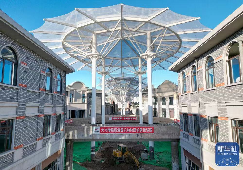 12月9日,工人在河北省唐山市路南区建国里老商业街改造项目建设现场施工。