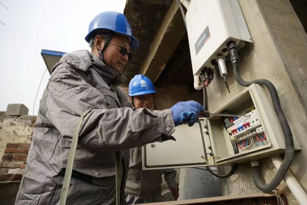 ↑12月10日,国网玉田县供电公司工人在玉田县林头屯乡东芦庄村一户居民家中检修光伏并网专用箱。