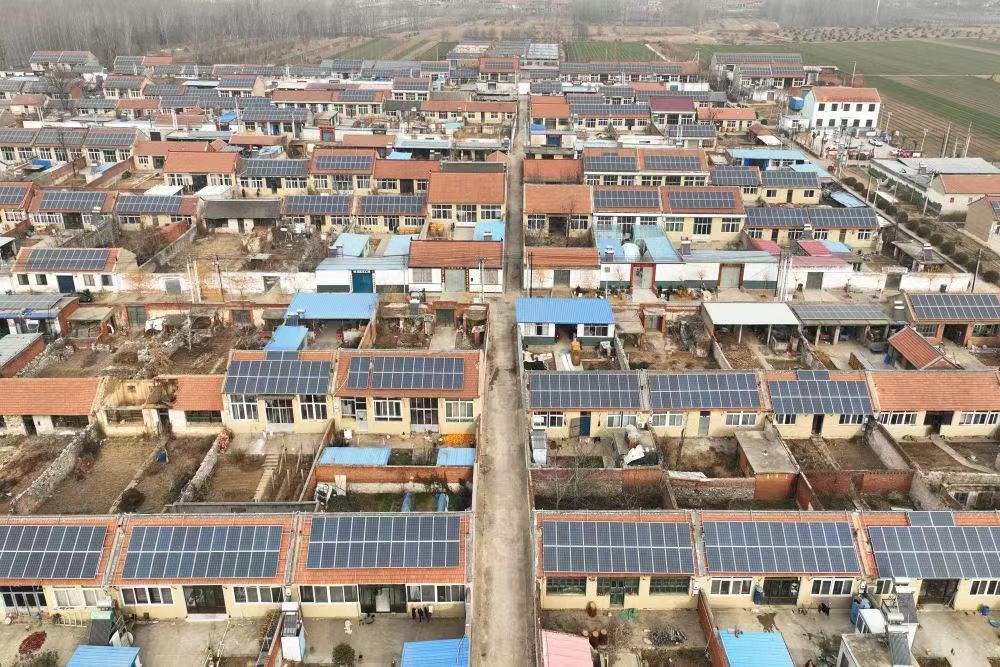 ↑河北省玉田县郭家屯镇四角山村内的屋顶光伏发电设备(12月10日摄,无人机照片)。
