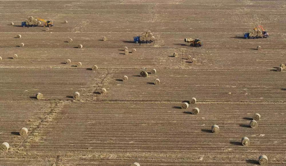 ↑12月10日,在唐山市曹妃甸区第八农场田间,稻草回收企业的工人将打好捆的稻草装车(无人机照片)。
