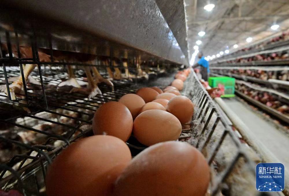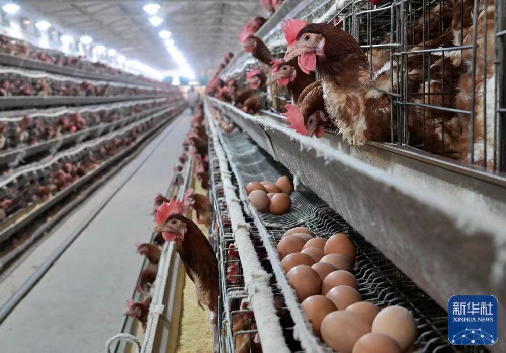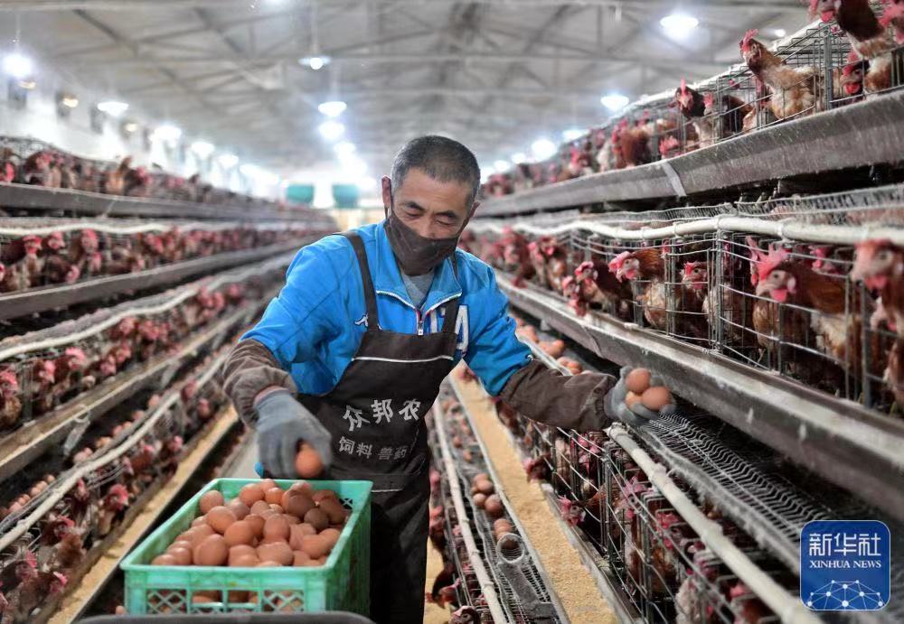 ↑12月16日,河北省滦州市滦城街道办事处后明碑村一家蛋鸡养殖合作社的社员在鸡舍内捡拾鸡蛋。