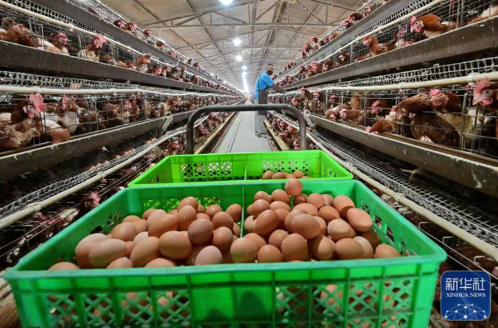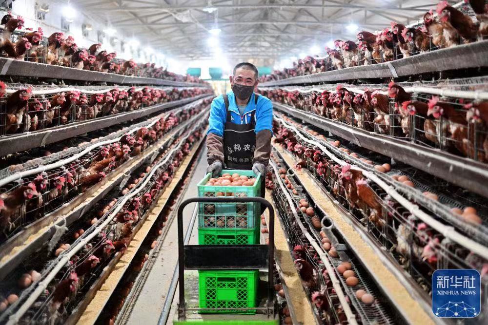 ↑12月16日,河北省滦州市滦城街道办事处后明碑村一家蛋鸡养殖合作社的社员在将捡拾的鸡蛋运出鸡舍。