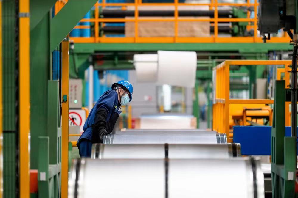 工作人员在首钢智新迁安电磁材料有限公司取向电工钢产品包装线上巡检。新华社记者 牟宇 摄